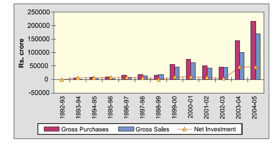 Figura 1. Investimento Institucional Estrangeiro, 2004-2005. Securities & Exchange Board of India (SEBI), Relatório Anual 2004-2005: PARTE DOIS: REVISÃO DAS TENDÊNCIAS E OPERAÇÕES, p. 38. Localizado em http://www.sebi.gov.in/annualreport/0405/Part2.pdf.