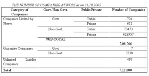 Em Outubro de 2005, existiam quase 80.000 empresas públicas não governamentais activamente registadas na Índia (ver Figura 2). Em termos de empresas privadas, mais de 600.000 estão atualmente ativas e registradas. Para as empresas indianas que desejam fazer negócios fora do país, o ímpeto para atribuir a novas exigências regulatórias não é a sua própria lei, mas sim os efeitos de um mercado global.[40] Este tipo de cumprimento voluntário é em grande parte visto como resultado das tendências de governança corporativa que visam promover as tentativas mundiais de se tornar mais transparentes. Outra razão para este movimento voluntário na Índia é também provavelmente devido à lentidão do sistema judicial, que pode levar de 10 a 20 anos para se chegar a um veredicto no direito corporativo.[41] Isso certamente demonstra um benefício claro de ter cada estado nos EUA administrando sua própria lei corporativa. Estados como Delaware, que compreende um grande volume de história corporativa, tornaram isso fácil. Assim, com o desenvolvimento do Sarbanes-Oxley-uma lei aprovada pelo governo federal - deve-se perguntar se os EUA estão caminhando para um sistema corporativo que terá tribunais estaduais interpretando a lei federal. Além disso, esse tipo de sistema também está sendo desenvolvido na Índia? Ou seja, está a Índia a experimentar o crescimento de um sistema corporativo que é regulado pelo governo federal em conjunto com os estadosou sem qualquer influência estatal.